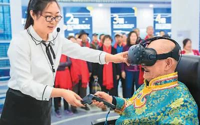 重陽節前后,內蒙古呼和浩特市玉泉區邀請轄區老年人走進該區新投入運營的大數據應用產業基地,近距離感受新科技帶來的生活和工作方式的變化。下圖為一位老人在體驗VR眼鏡。